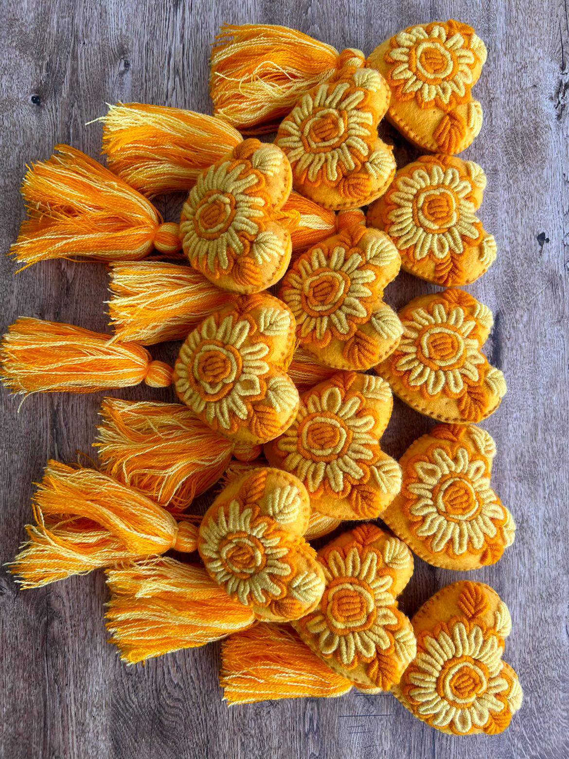 Beautiful and vibrant in color these heart shaped pompónes are beautiful and unique. They can be a perfect addition to a purse, serves a great home decoration purpose, to hang on doors, dress up your desk area, mirrors, or even on suitcases to easily identify them! All unique and all one of a kind. Beautiful flowers embroidered in the center of the heart.